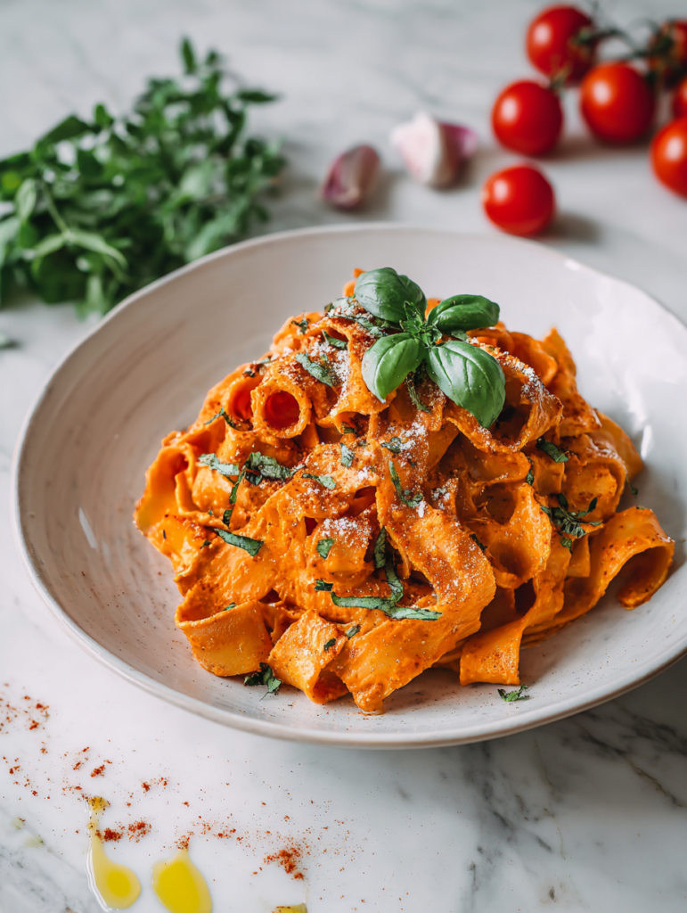 Focusing on creating a rich, velvety sauce without traditional dairy, using unexpected pantry ingredients that transform humble tomato pasta into a luxurious, comforting dish.